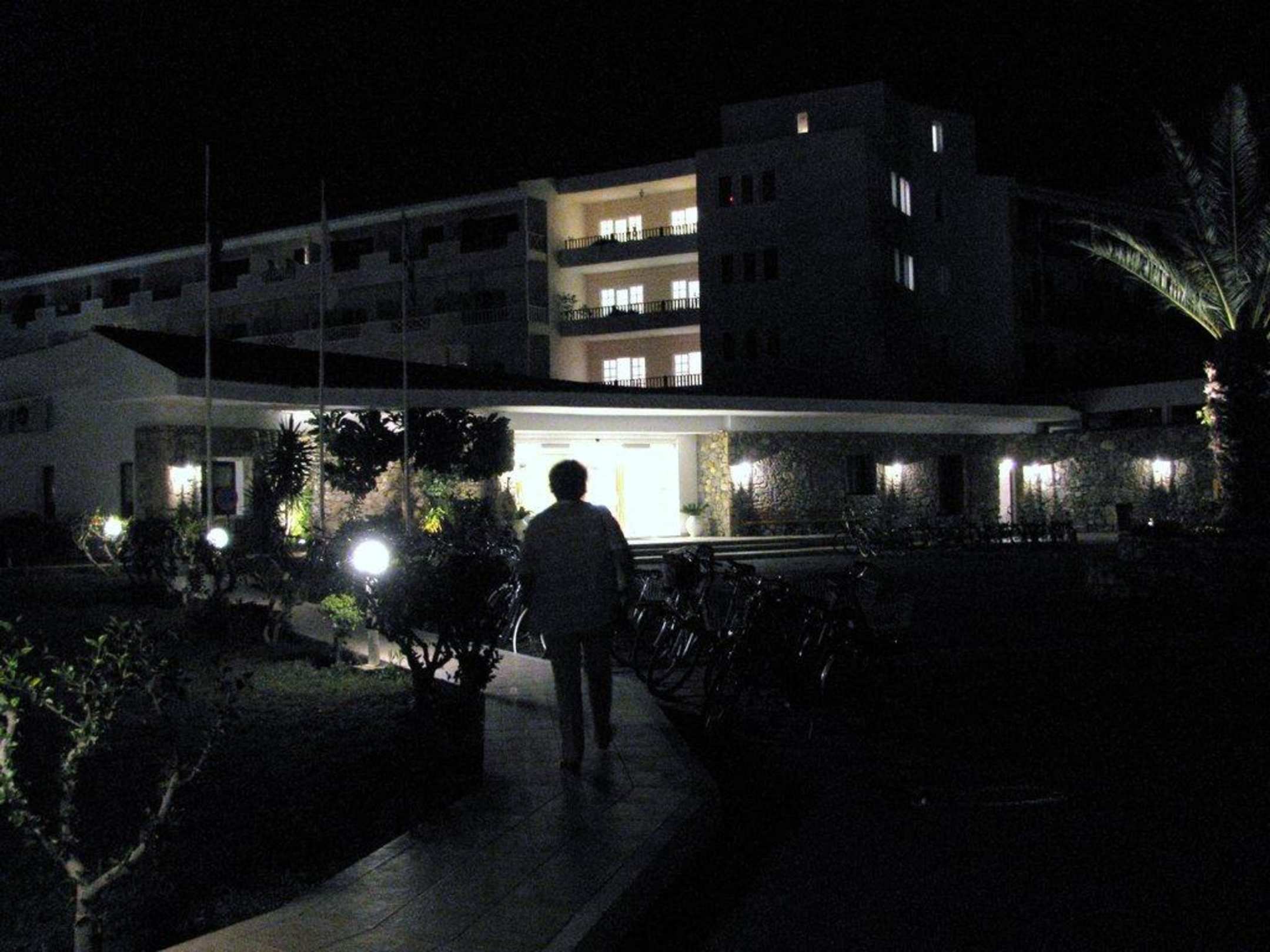 Eingang des Hotels am Abend