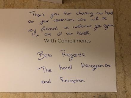 Abschiedsgrüße von Management und Rezeption. Wir kommen auf alle Fälle gerne wieder!