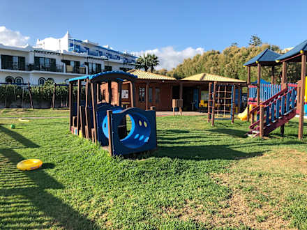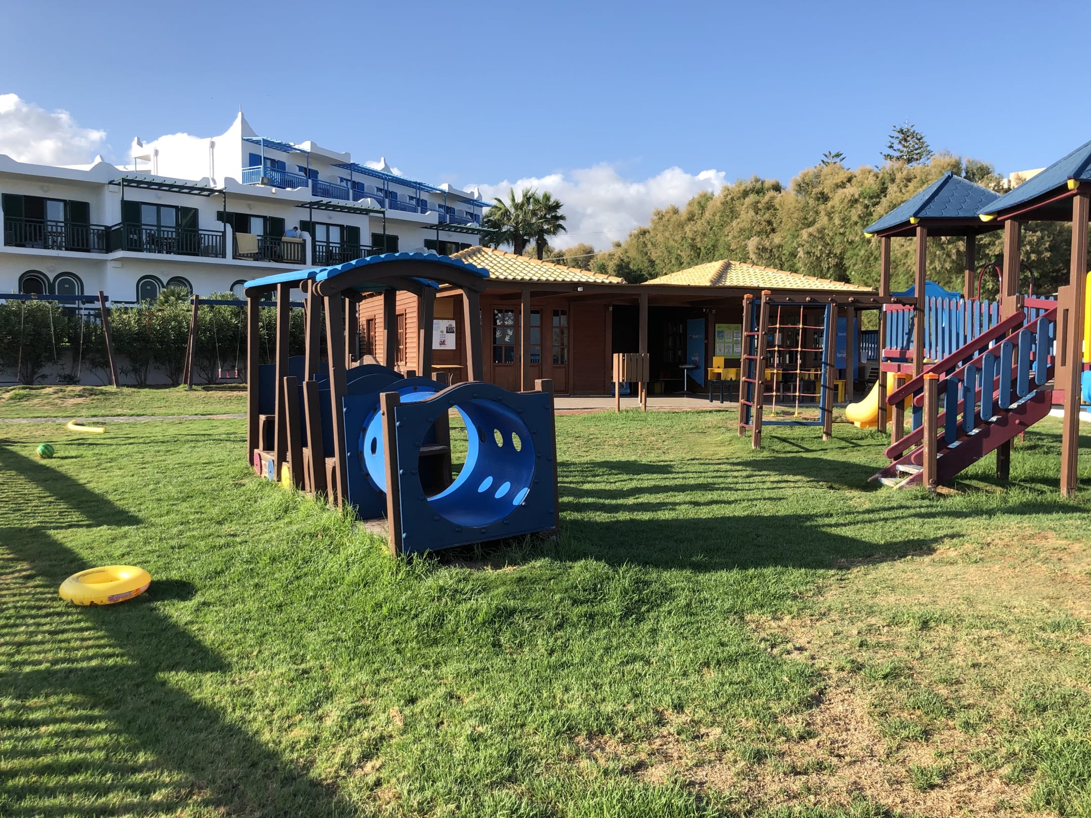 Kinderspielplatz des Kidsclubs sowie das Kidsclubhaus, dahinter Zimmer des Nebengebäudes