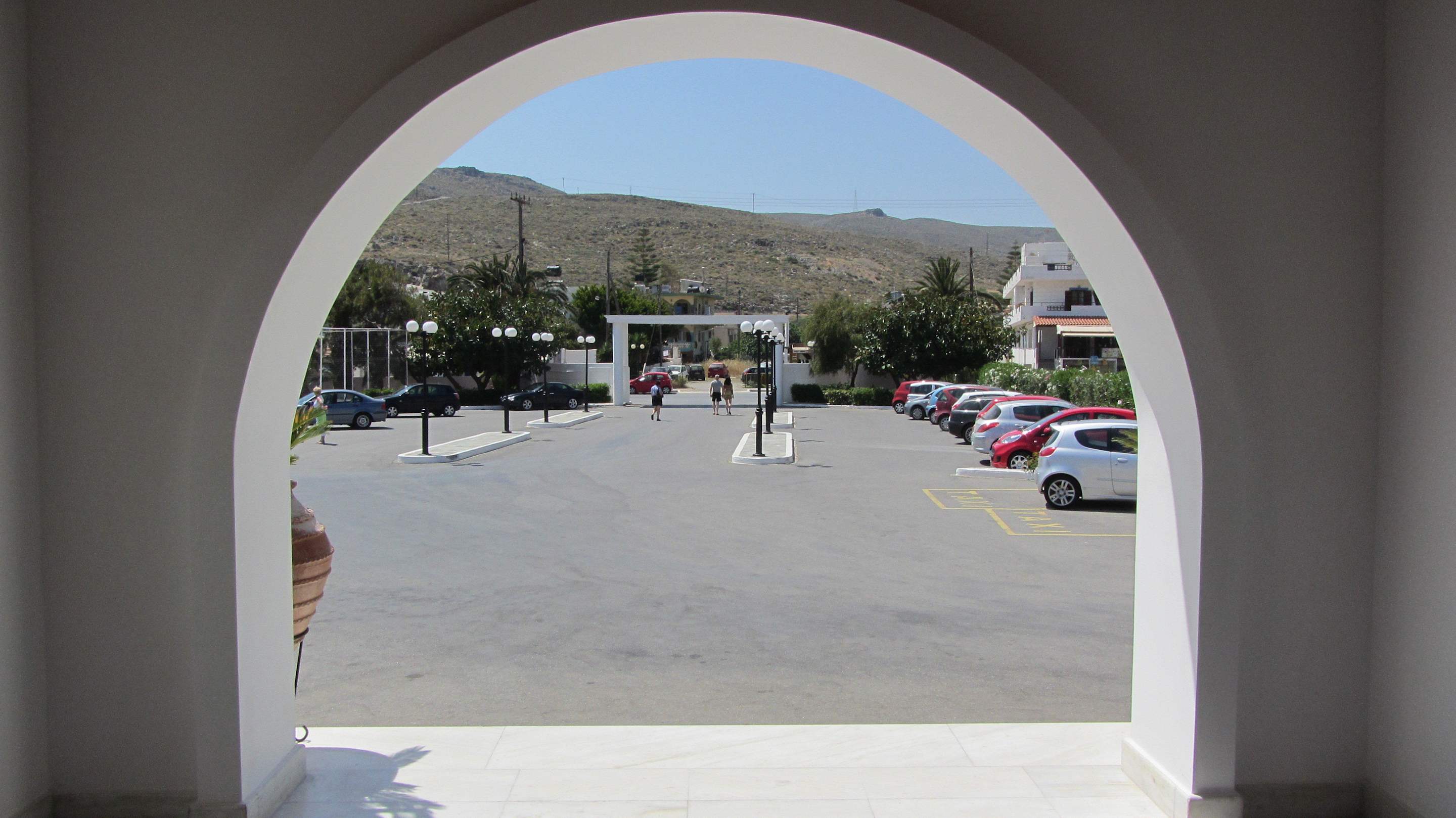 Blick aus der Lobby zum Parkplatz/Eingang