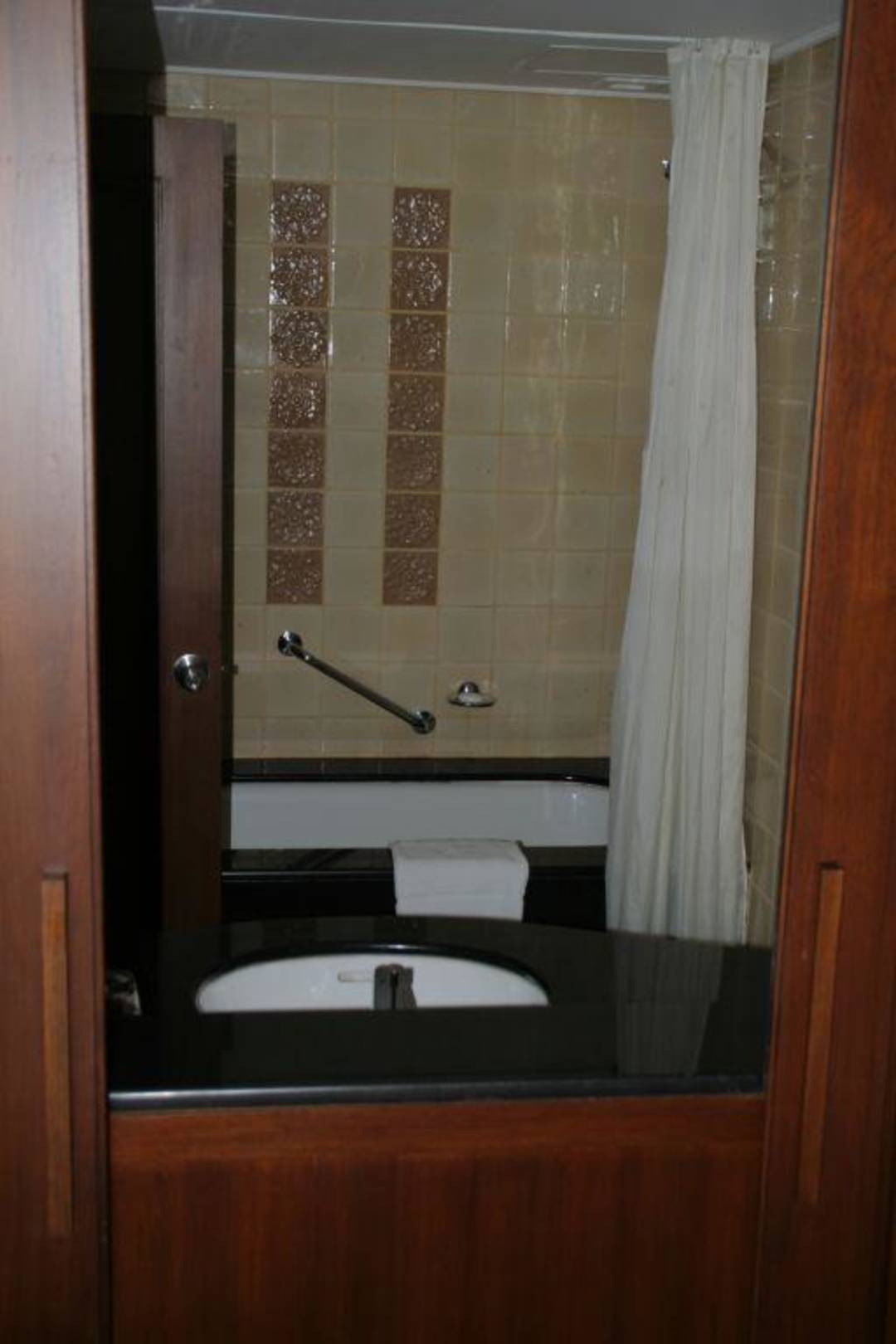 Bad im HauptgebäudeBlick von den Betten durch den Schiebespiegel in das Bad auf Waschbecken und Badewanne