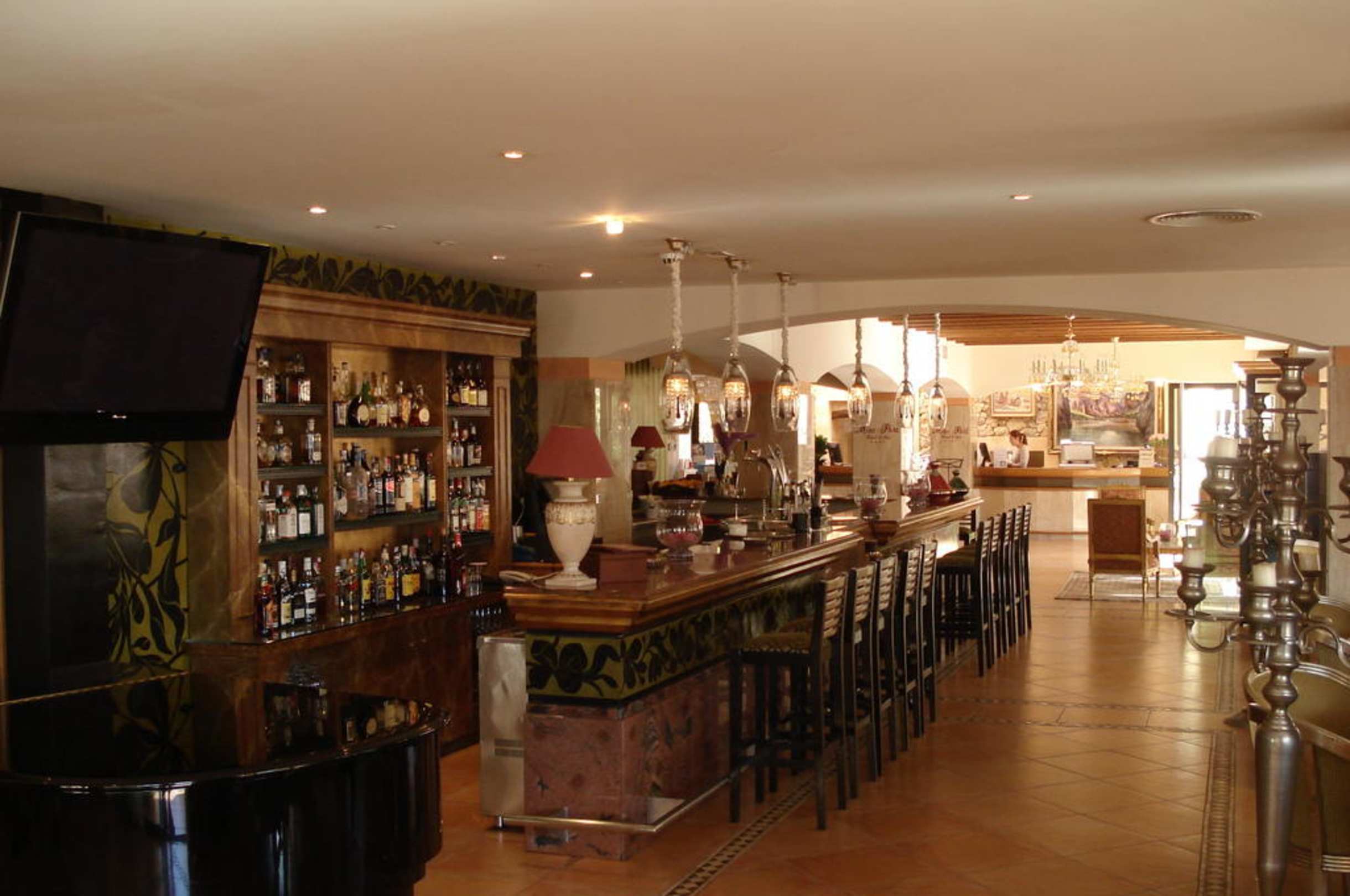 Blick von der Terasse zur Bar, im Hintergrund der Eingang und die Rezeption.