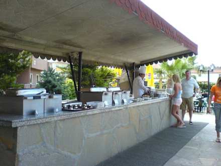 Hier gibt es frisch zubereitetes Omlett, Spiegelei, Rührei, Pfankuchen oder auch 3 Minuten und 5 Minuten Ei, sowie jeden Morgen wechselnde andere Leckerreien.
