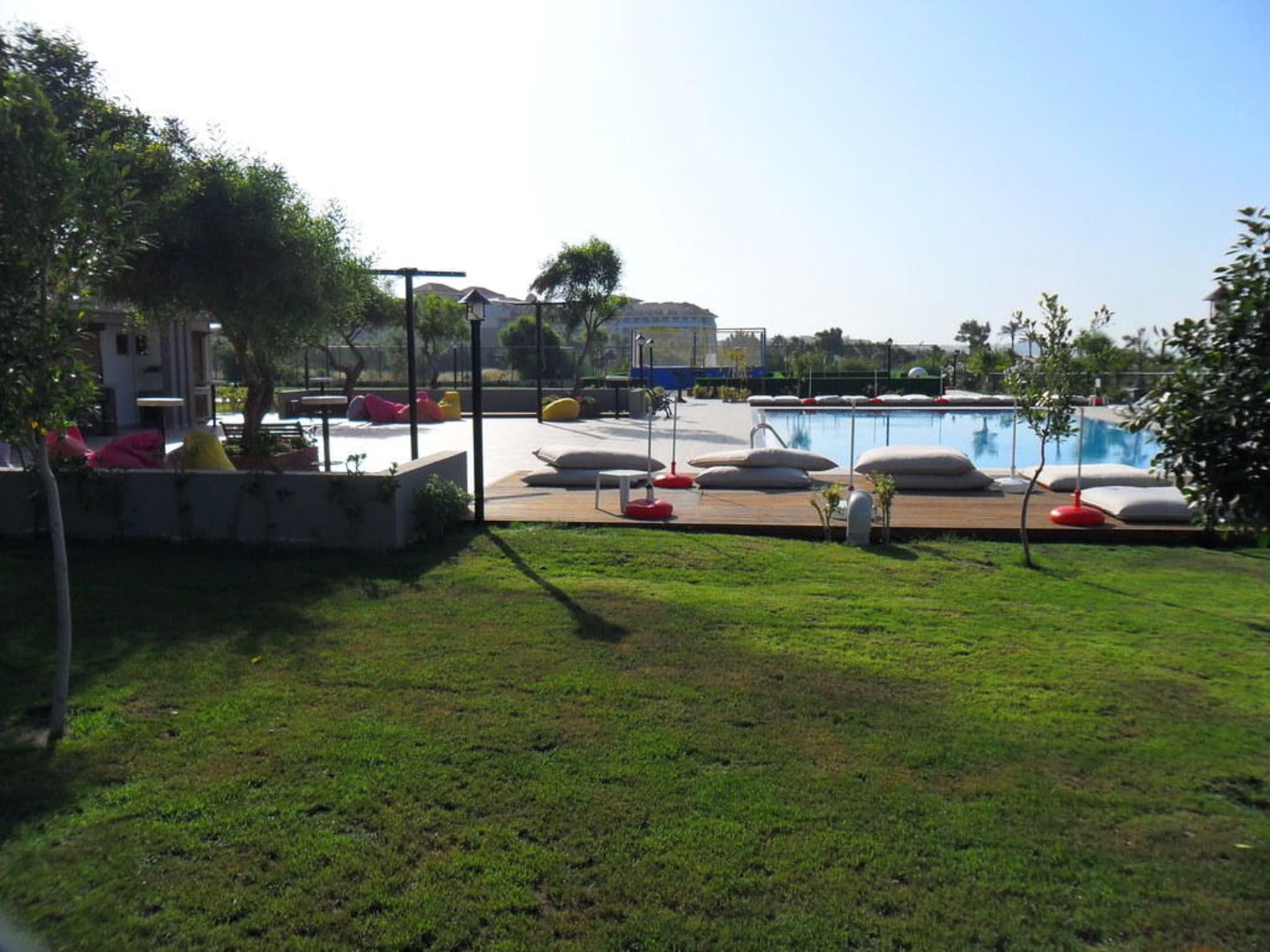 Richtung Strand ist noch ein Funpark mit pools, einer bar, kletterwand, spielplatz, trampoline und weiche liegekissen und sandsitzsäcke am pool