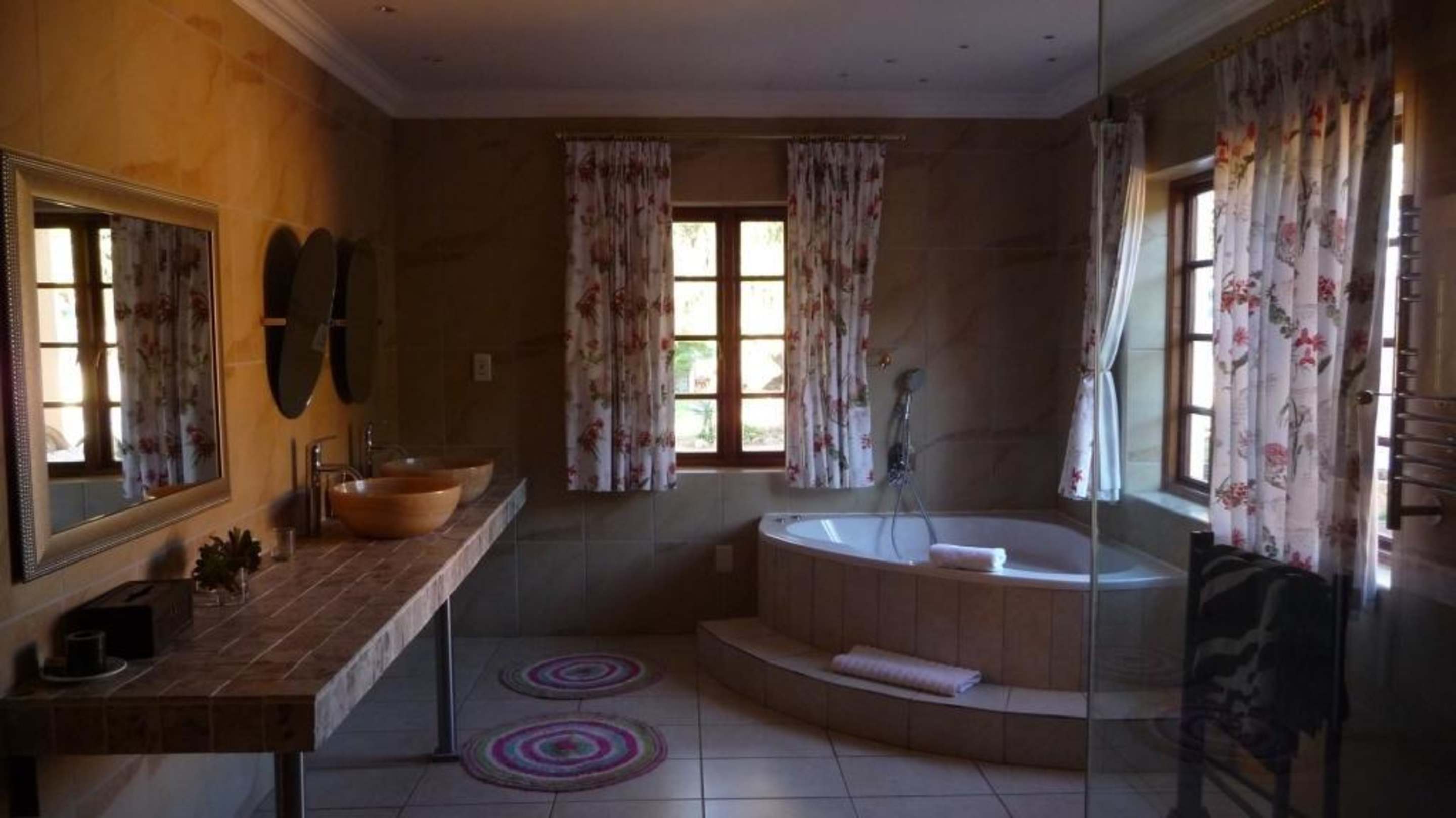 Ein Teil des Badezimmers. Auf dem Bild fehlt die Dusche bzw. die beiden Duschen - eine große Kabine mit normaler Dusche und einer mit Massagedüsen usw.