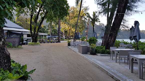 rechts zu sehen ein Teil des Strandrestaurantes, im Hintergrund rechts das Meer, links ist das Restaurant zu sehen (Frühstück....). Der Weg ist die "Flaniermeile" aber auch der Weg, wo die hoteleigenen Fahrzeuge fahren