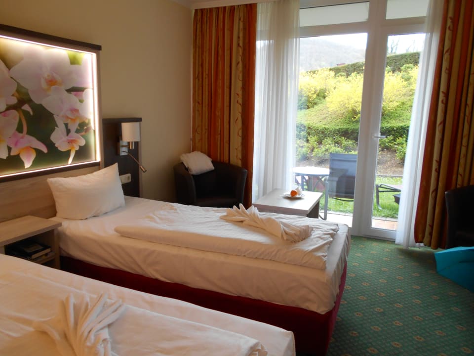 Zimmer mit zwei Einzelbetten und Terrasse direkt am Garten