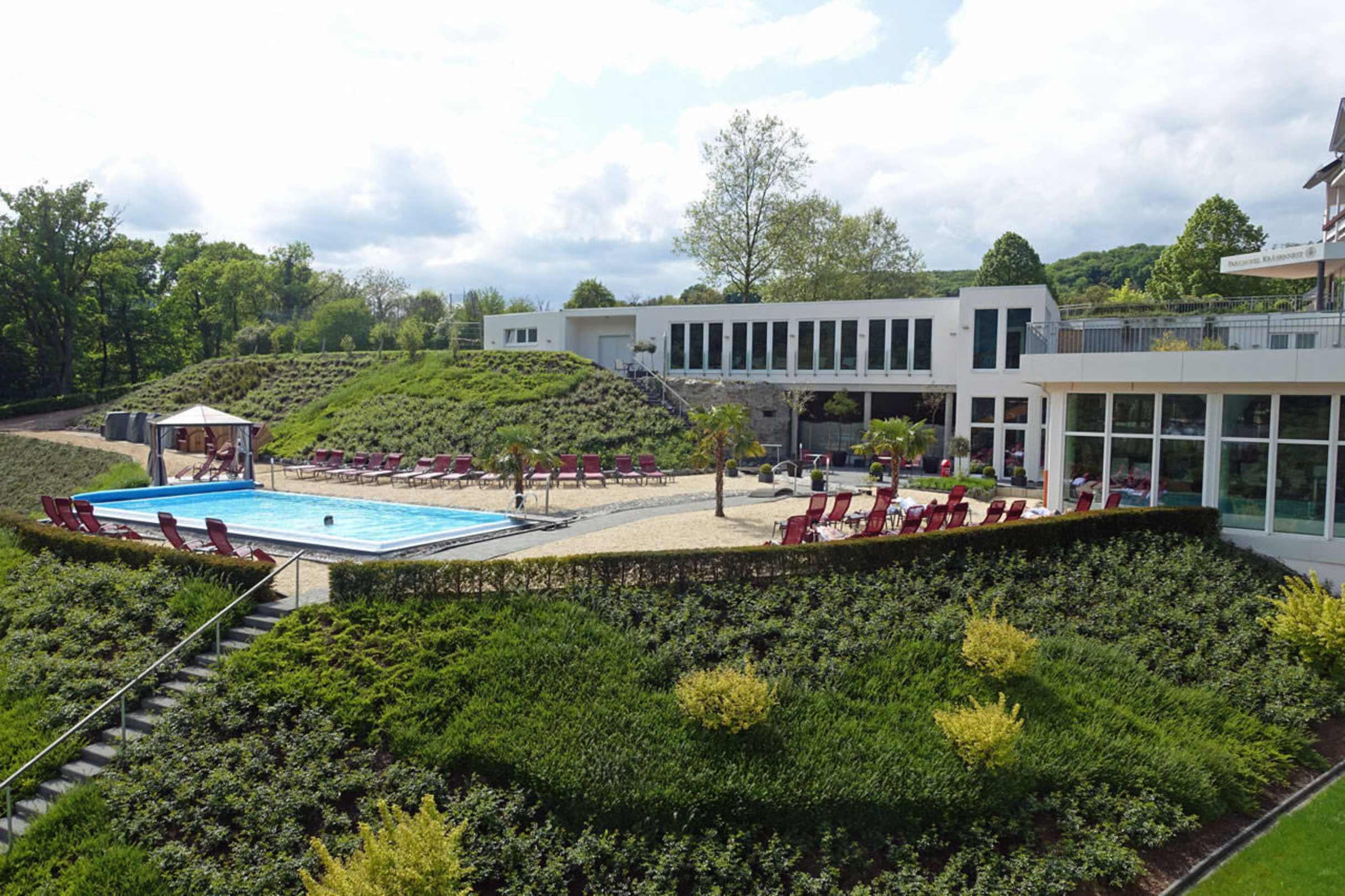 Blick auf Pool mit Ruheräumen und Hallenbad
