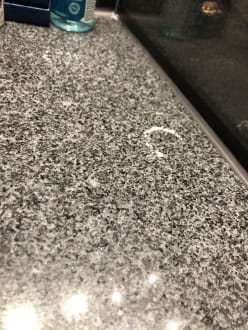 ZimmerDie Flecken im Bad am Waschtisch, die durch einen Papierdeckel kommen, der nass war und seit 5 Tagen nicht entfernt werden