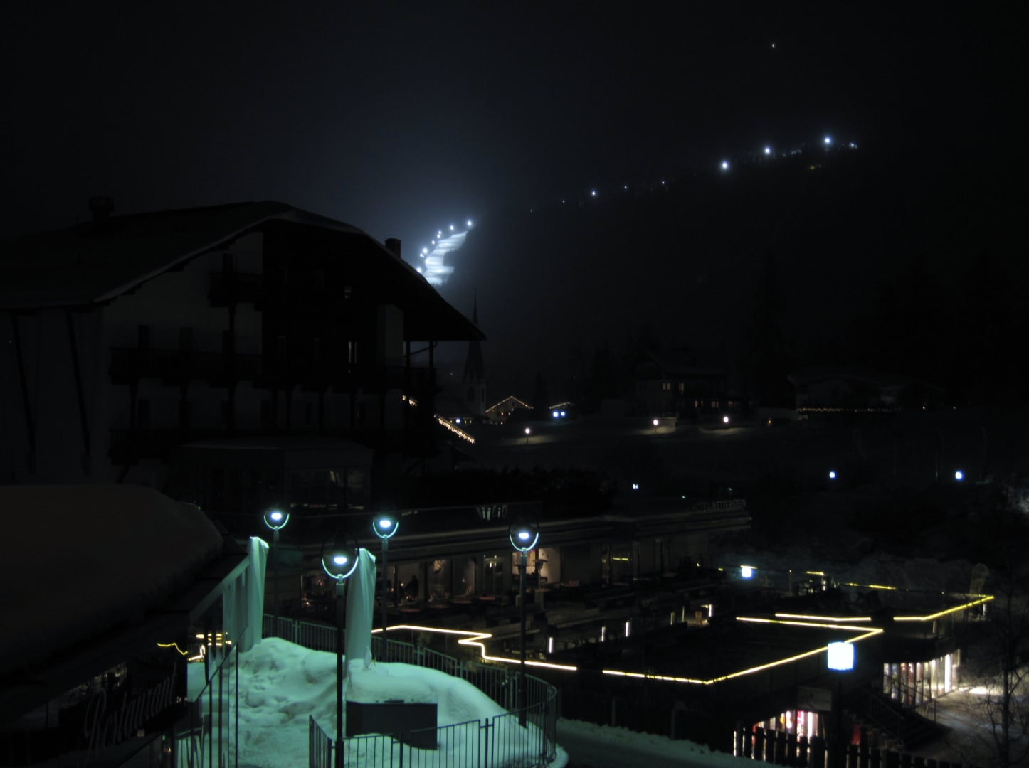 View of the lit ski slope of Roshutte MountIn reality you can see even the lights of ratraks that move over the mount.