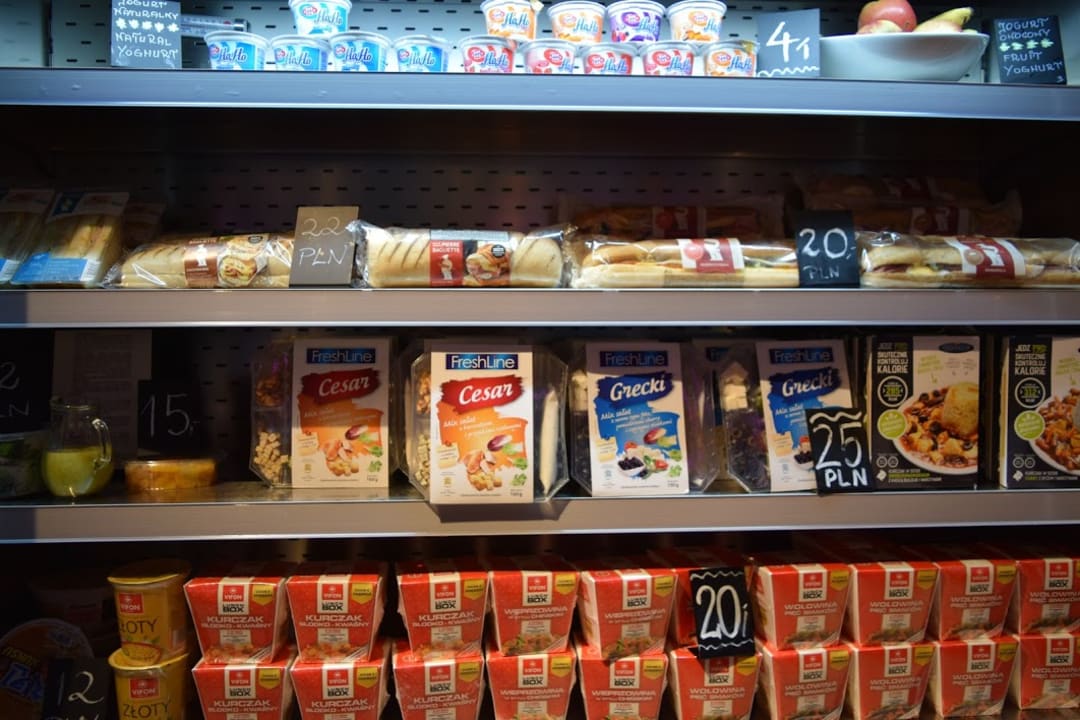 GastroHotel-Shop mit Sandwiches, Obst, Nudeln und Joghurt. Ein Sandwich oder die Instant-Nudeln kosten z.B. 20-22 PLN. Das sind etwa 5 Euro.