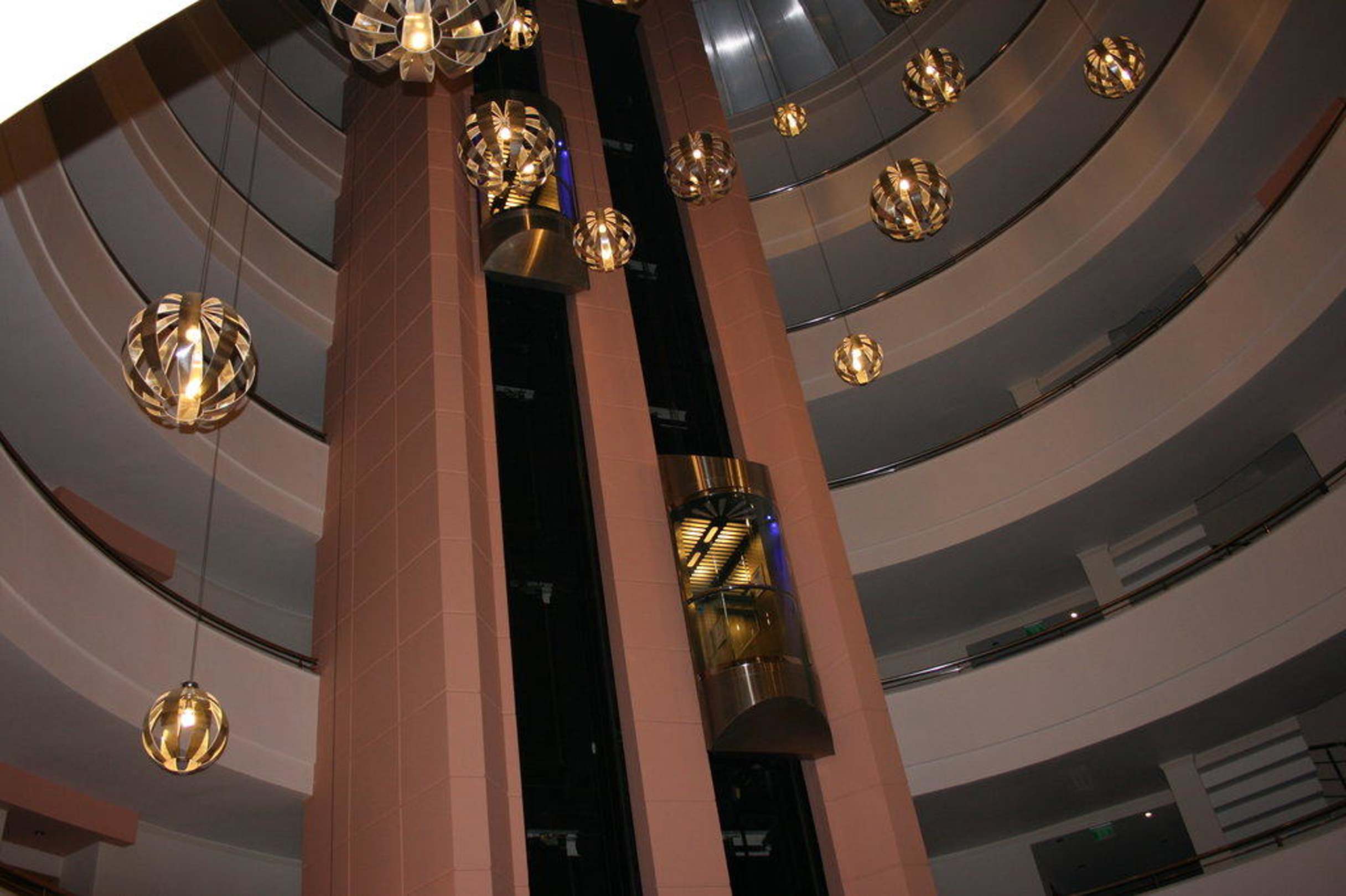 Lobby mit innenliegenden Fahrstühlen zu den einzelnen Zimmeretagen