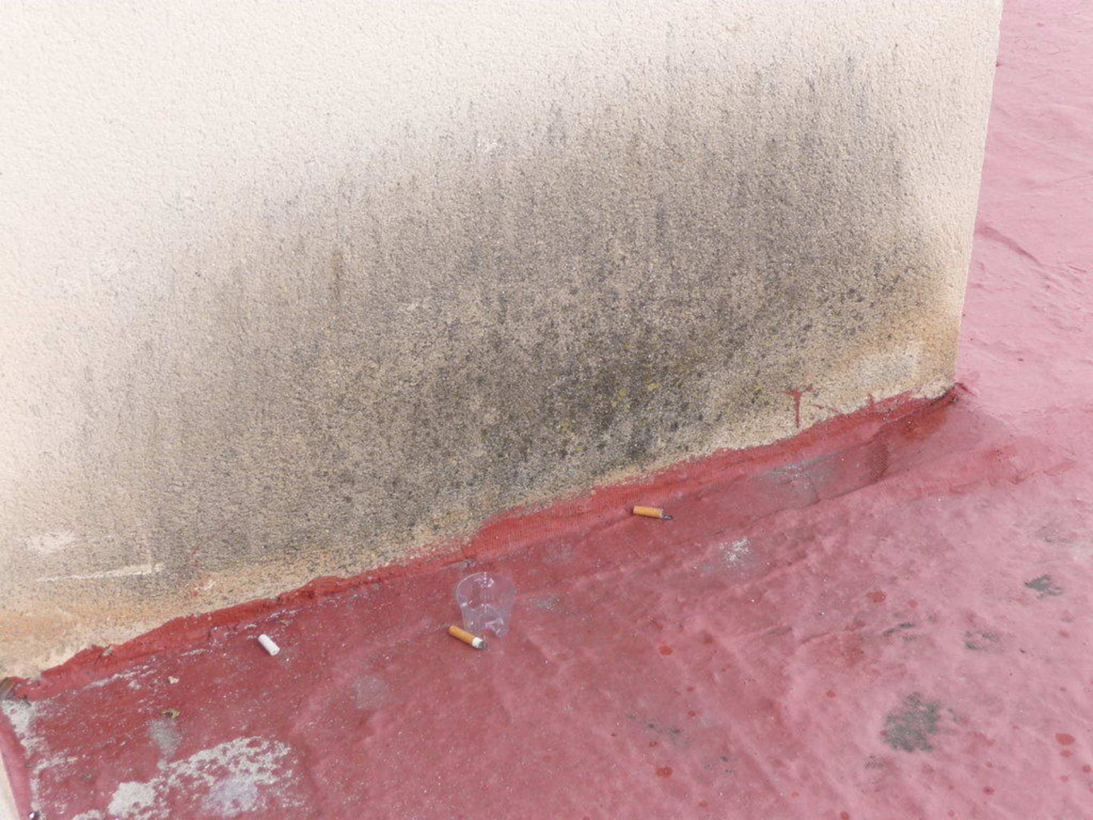 Müll auf dem Dach vor dem Balkonheruntergekommene Außenfassade mit Müll und Kippen von oben