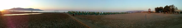 1. Teil des 360 Grad Panorama´s vom Hotel Strand. Zu sehen, der Strandabschnitt vom Hotel mit den Liegen und Sonnenschirm und dem weiten Strandausläufern (links 4km bis Georgopoulis, rechts Richtung Rethimnon)