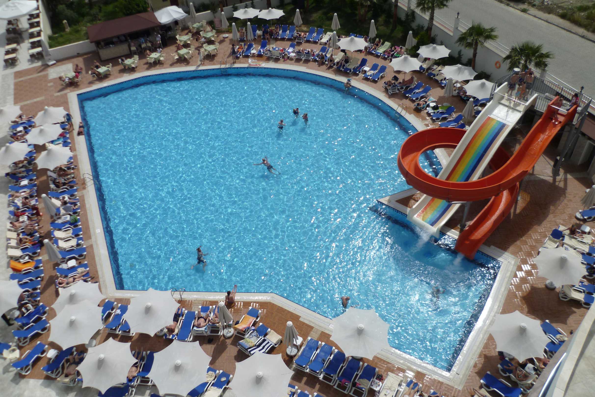 Blick auf den Pool vom Balkon