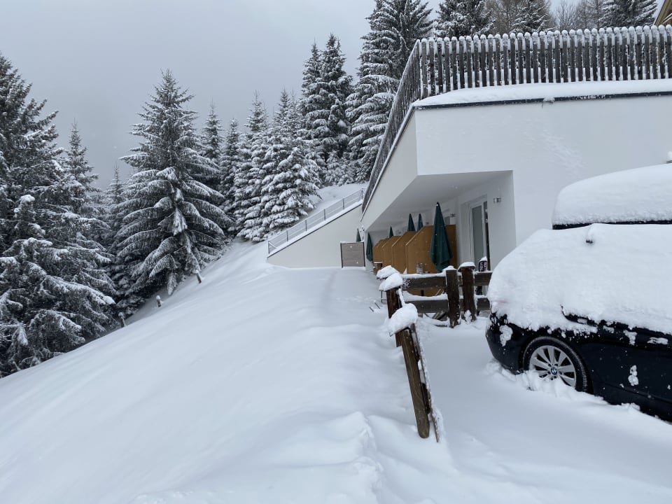 SonstigesTerrassen bei den Zimmer im Nebengebäude. Sicht nach Südwesten. Darüber Kinderspielplatz mit viel Schnee ;-)