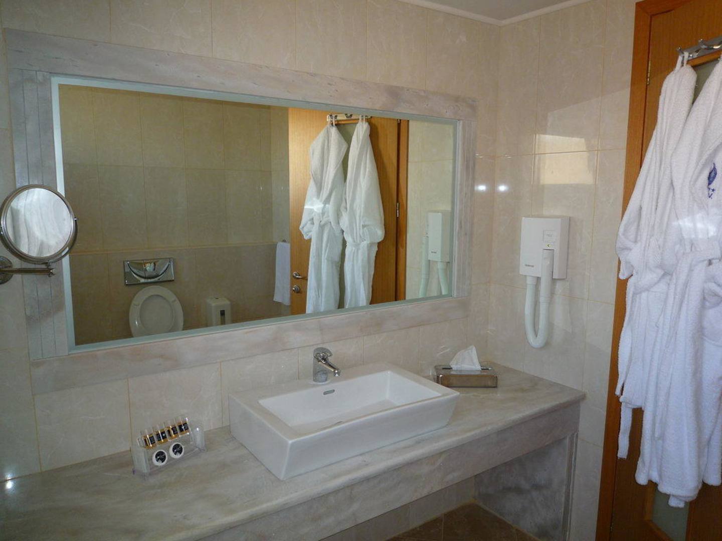 Das Bad mit extra Schminkspiegel, Fön und Bademänteln.