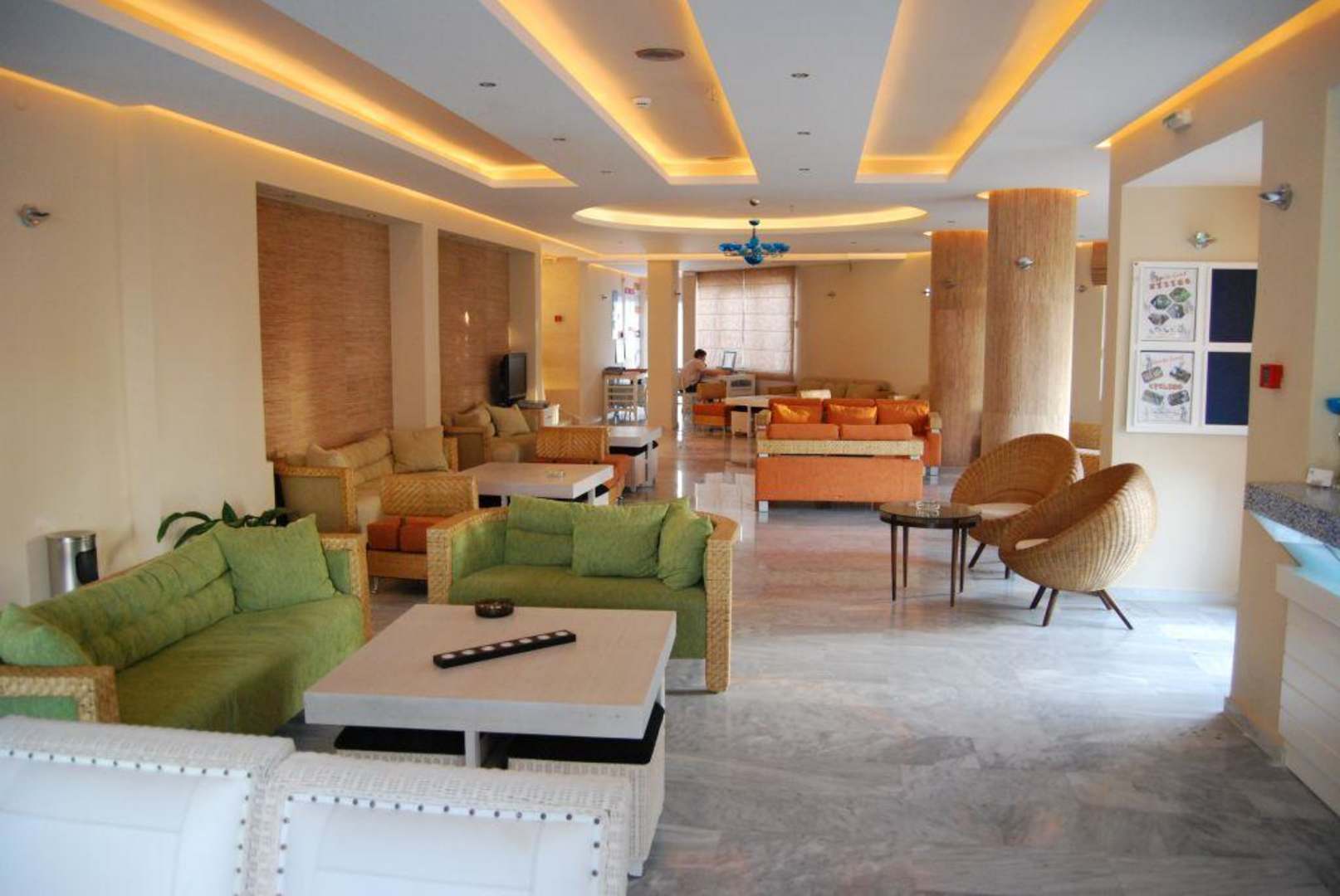 Ein Blick in die Empfangshalle und den Aufenthaltsraum im Nefeli Hotel. Am rechten Bildrand sieht man noch ein Stück von der Rezeption, hinten erkennt man TV- und Internetecke.