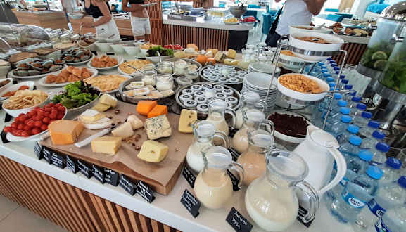 Frühstücksbuffet im Hotel. Verschiedene Milchsorten, Wasser, Käse.