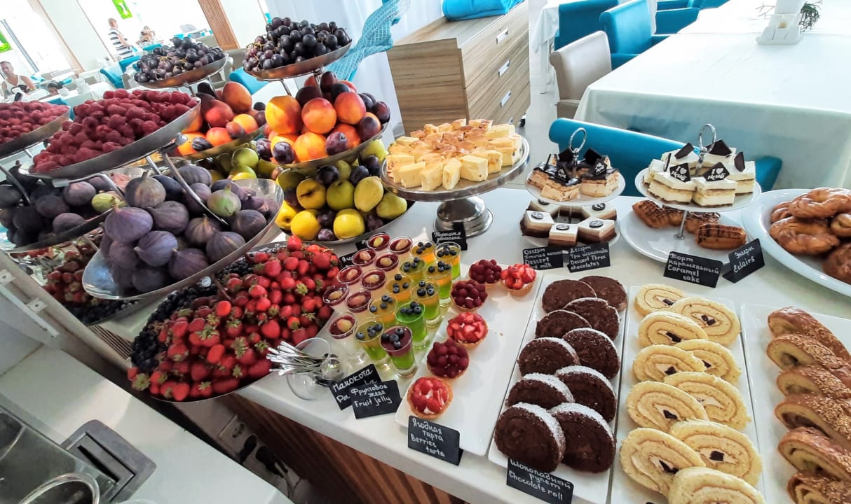 Frühstücksbuffet im Hotel. Kuchen, Desserts und Früchte.