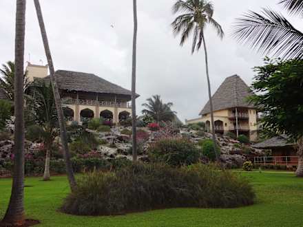Blick zum Spa-Bereich und Bungalows am Hangzu sehen ist die Treppe, die nach oben zu den Bungalows am Hang führt