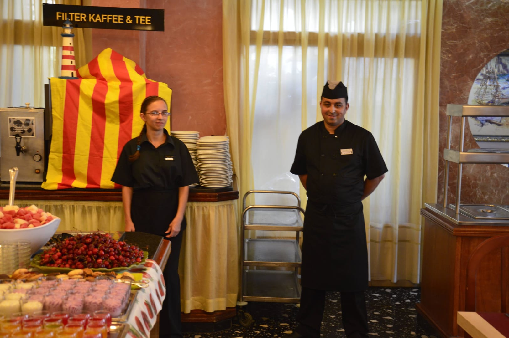Das Personal im Speisesaal ist sehr aufmerksam. Das Büffet ist immer sehr sauber und wird stets aufgefüllt. Das Speiseangebot ist sehr üppig und es schmeckt ausgezeichnet