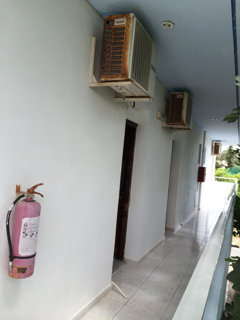 Rostige Klimaanlage und alter Feuerlöscher.