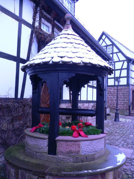 der Brunnen steht vor dem Eingang zum Restaurant