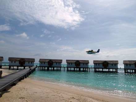 Wasserbungalows mit startendem Wasserflugzeug
