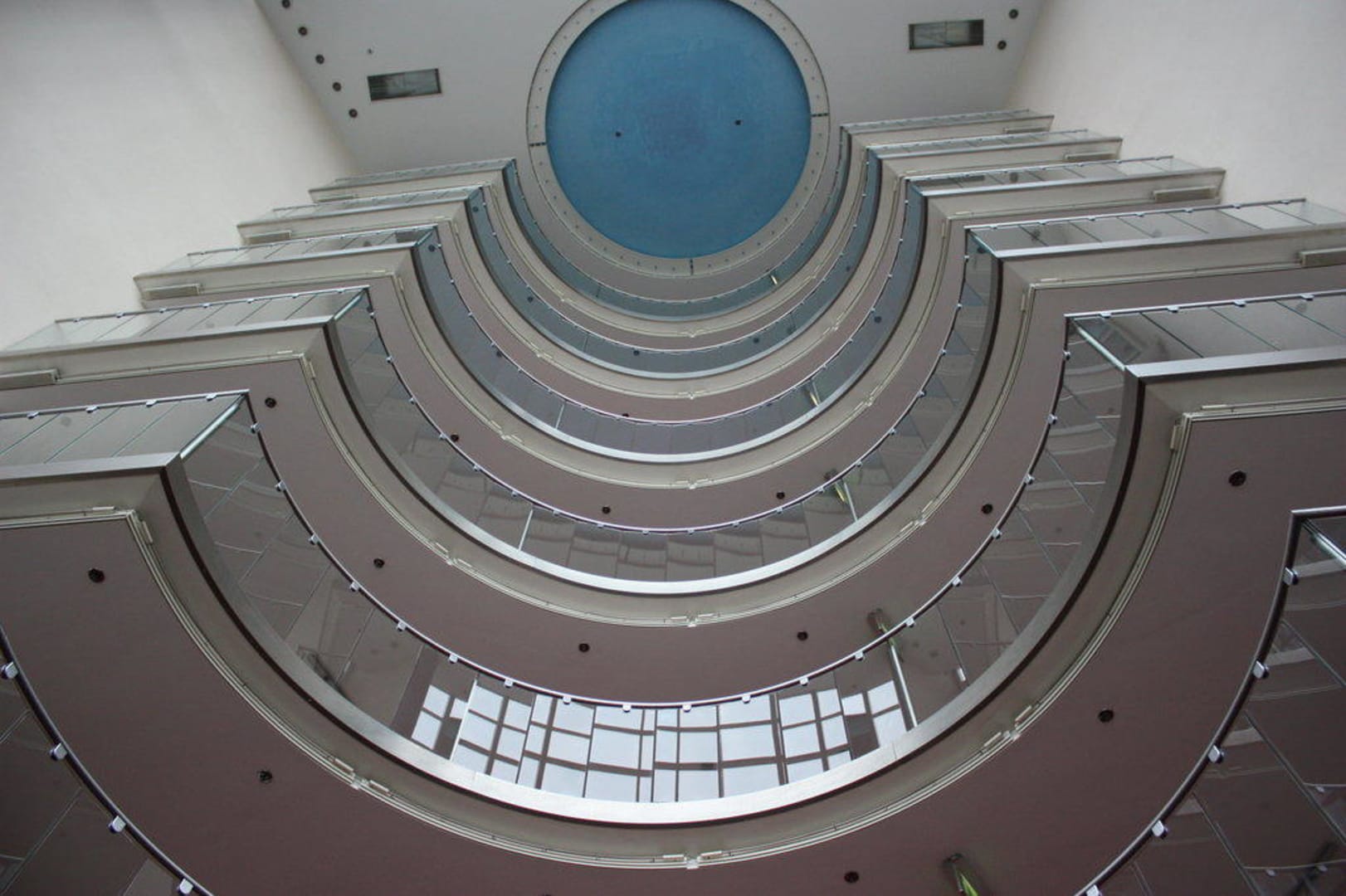 Aus der Lobby nach obenBlick von der Rezeption auf die gläsernen Balkone.
