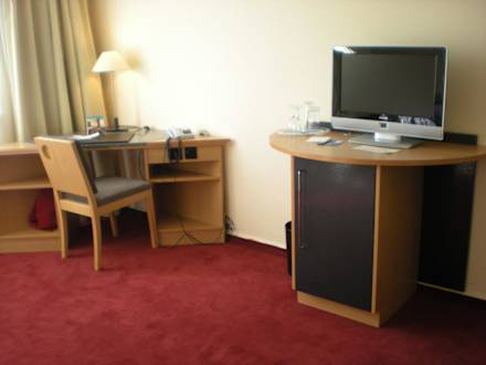 Schreibtischecke mit TV und Kühlschrank