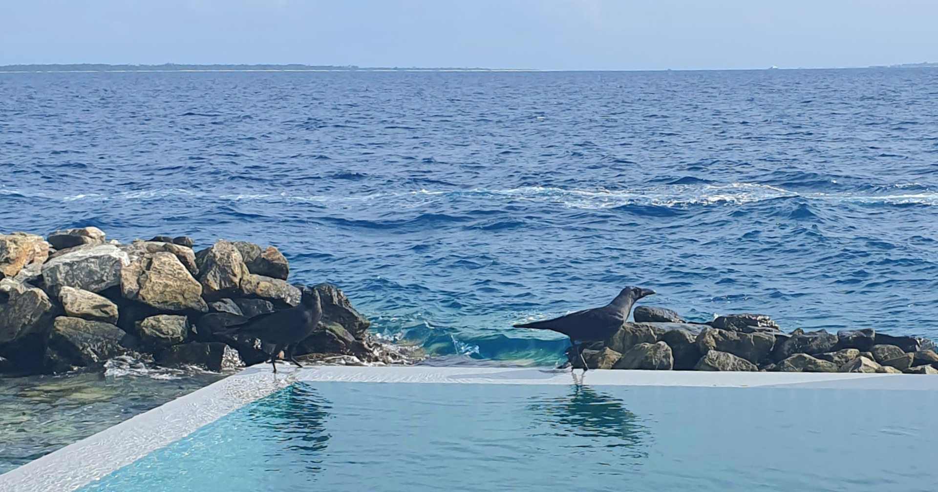 Pool der Wasservilla mit Vogelbesuch