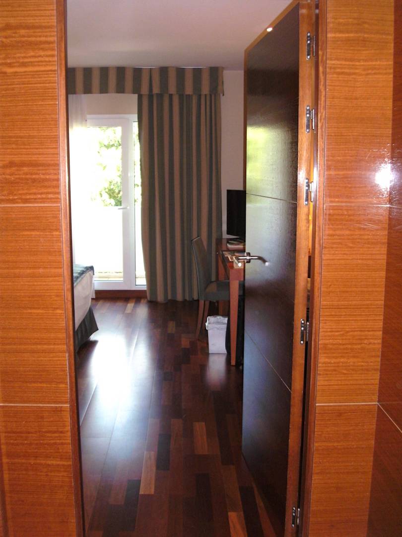 Eingangsbereich/WindfangIm Vorraum der kleine Wandschrank, links Zugang zum Bad. Das eigentliche Zimmer ist vom Vorraum durch eine weitere Tür getrennt. Somit nachts bei geschlossener Zusatztür sehr ruhig. Sehr edle Hölzer, sowohl Boden als auch Wände.