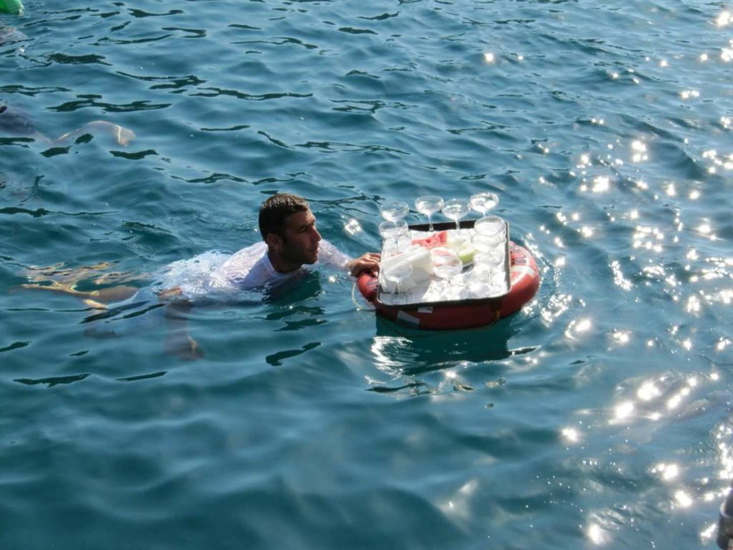 Schwimmender Kellner beim Yacht Frühstück