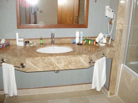 Waschbecken, rechts davon Bsadewanne