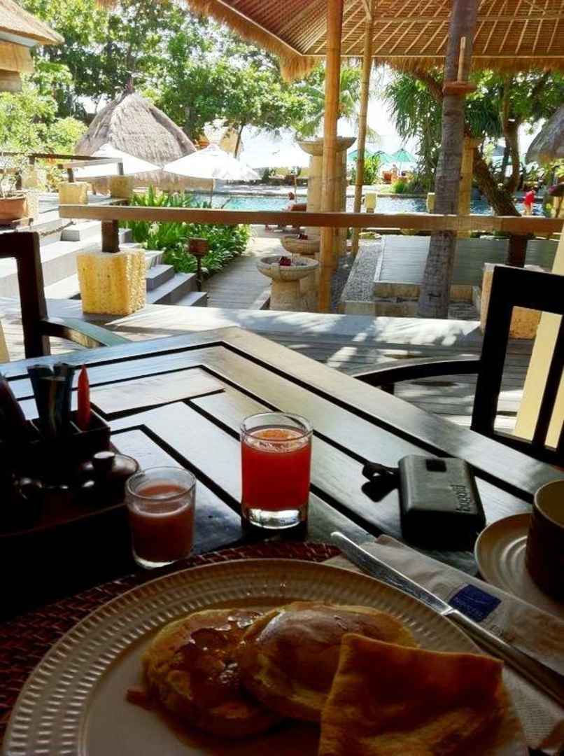 Frühstück: Pancakes am Pool mit Meerblick