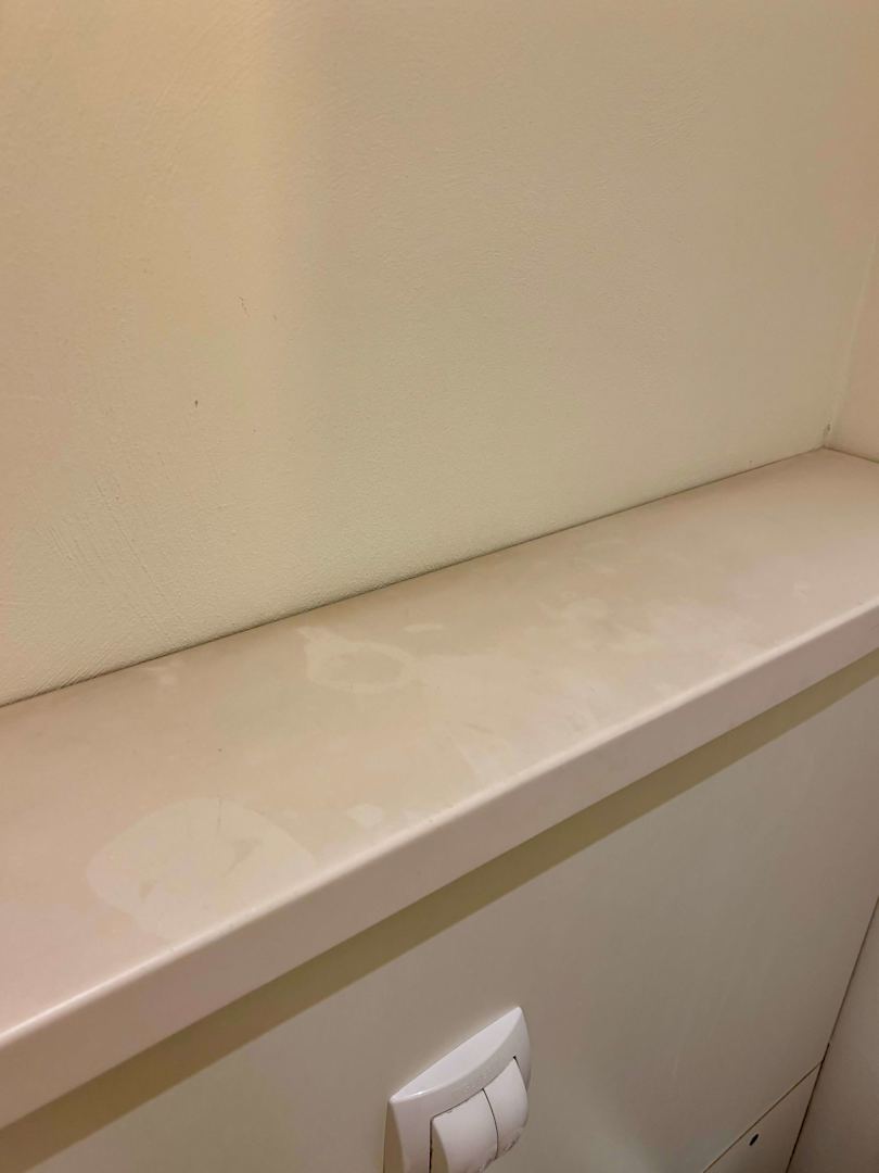 Ekelhaft staubige Ablage im Bad.