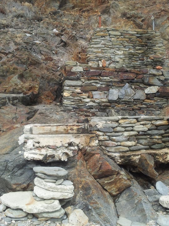 Die Dusche zum Hotelstrand. Fehlende Treppenstufen wurden mit großen Steinen kompensiert... Oben rechts kann man den Duschkopf sehen. Links unten geht man auf diese Empore...