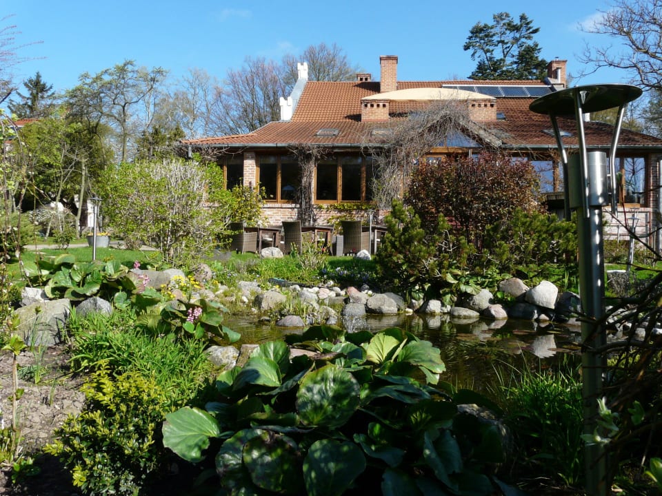 Aussicht über den Teich zum Restaurant