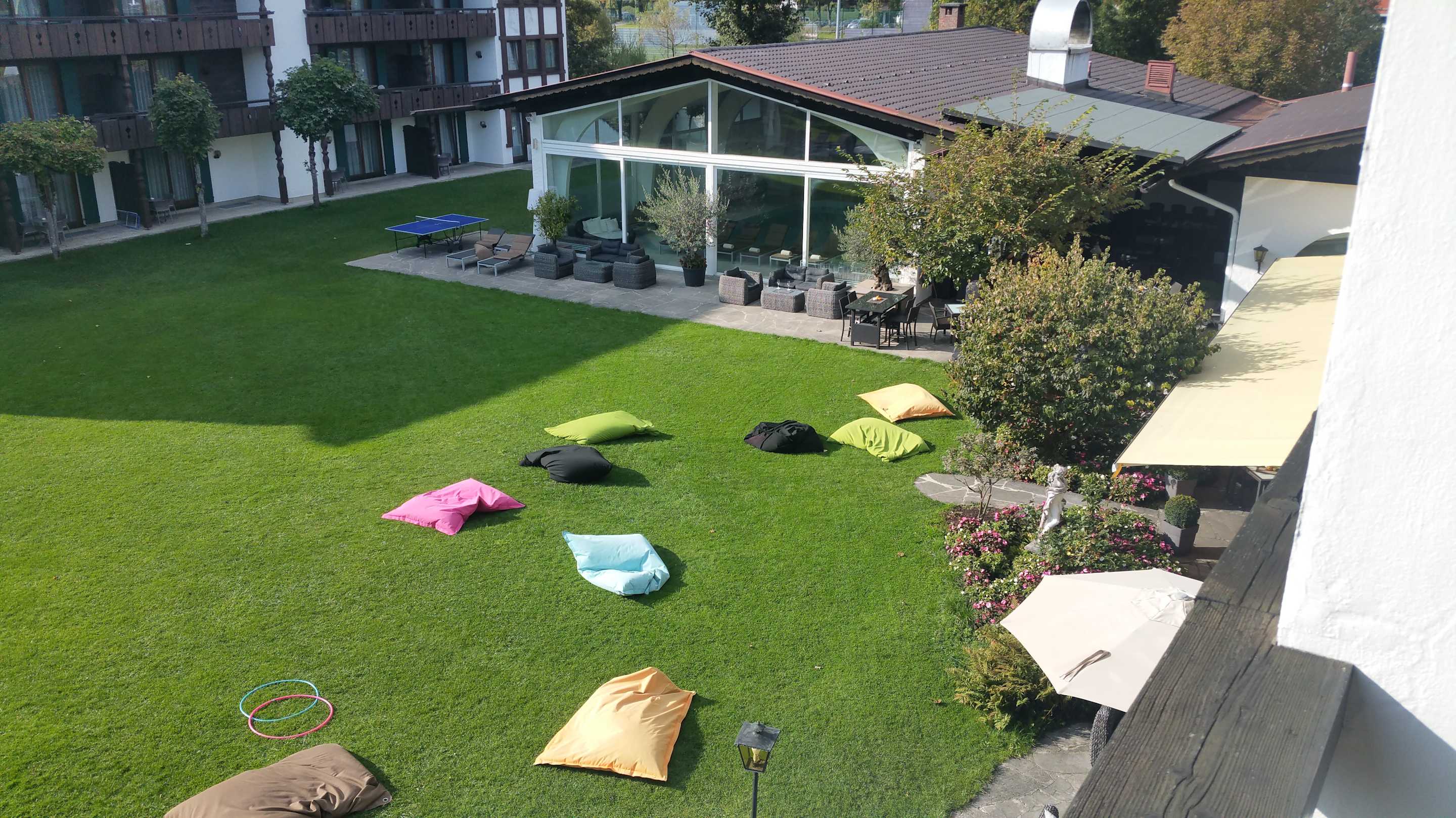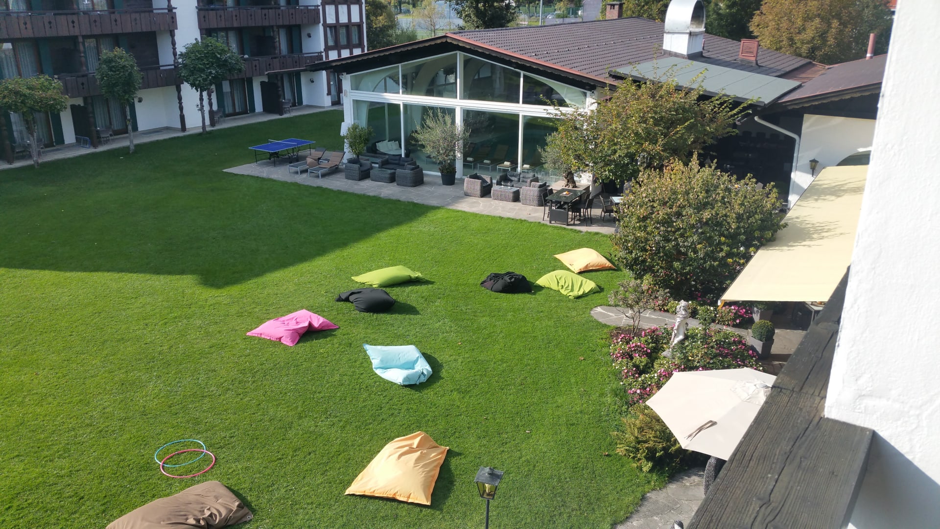 Zimmer 142 mit Blick aufs Nebengebäude und Hallenbad