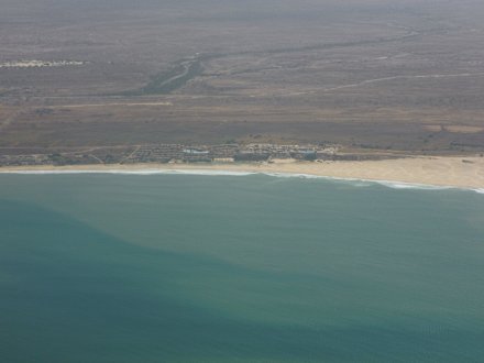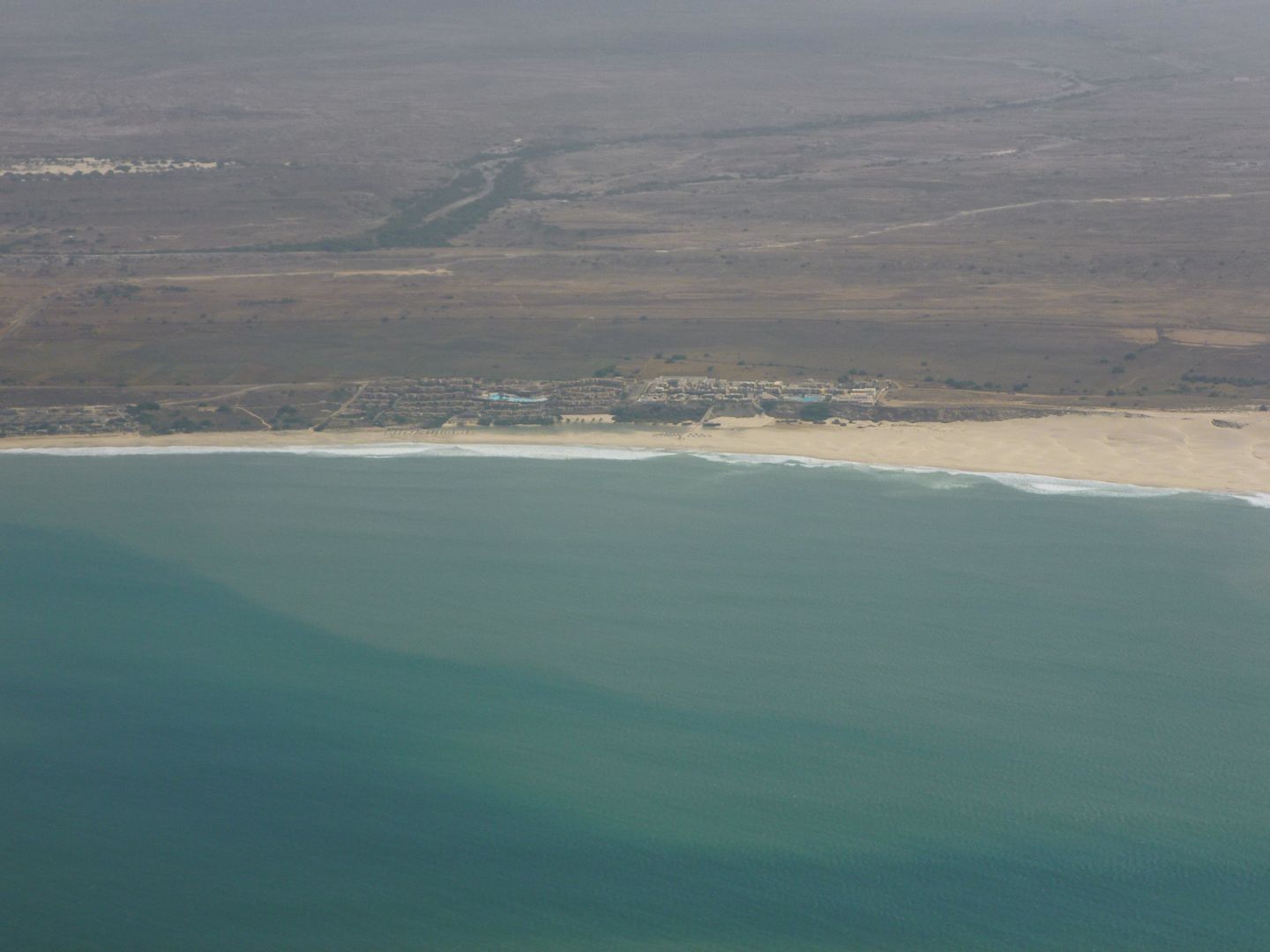 Die beiden blauen Pools sind gut zu sehen. Links das Decameron , rechts das Iberostar weiter rechts nichts als Dünen . Links geht es an RIU Karamboa zur Hauptsradt (4000 Einw.) Sal Rei