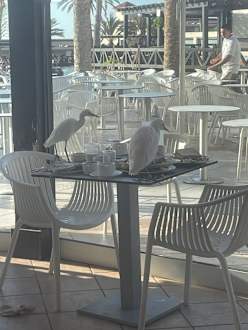 Frühstück, Tische werden nicht abgeräumt, Ibisse essen die Reste