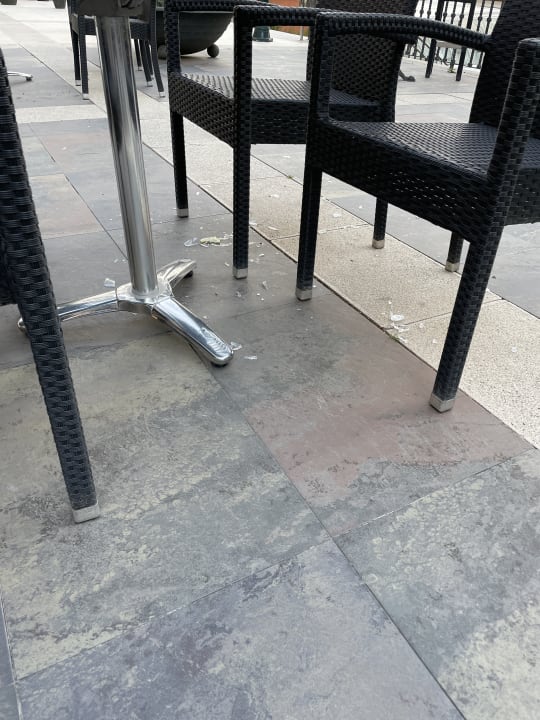 Ein Vogel schmeißt gegen 19 Uhr ein Glas vom Tisch. Die Mitarbeiterin räumt die restlichen Gläser ab und stellt die Stühle schützend über die Zitrone und die Scherben...