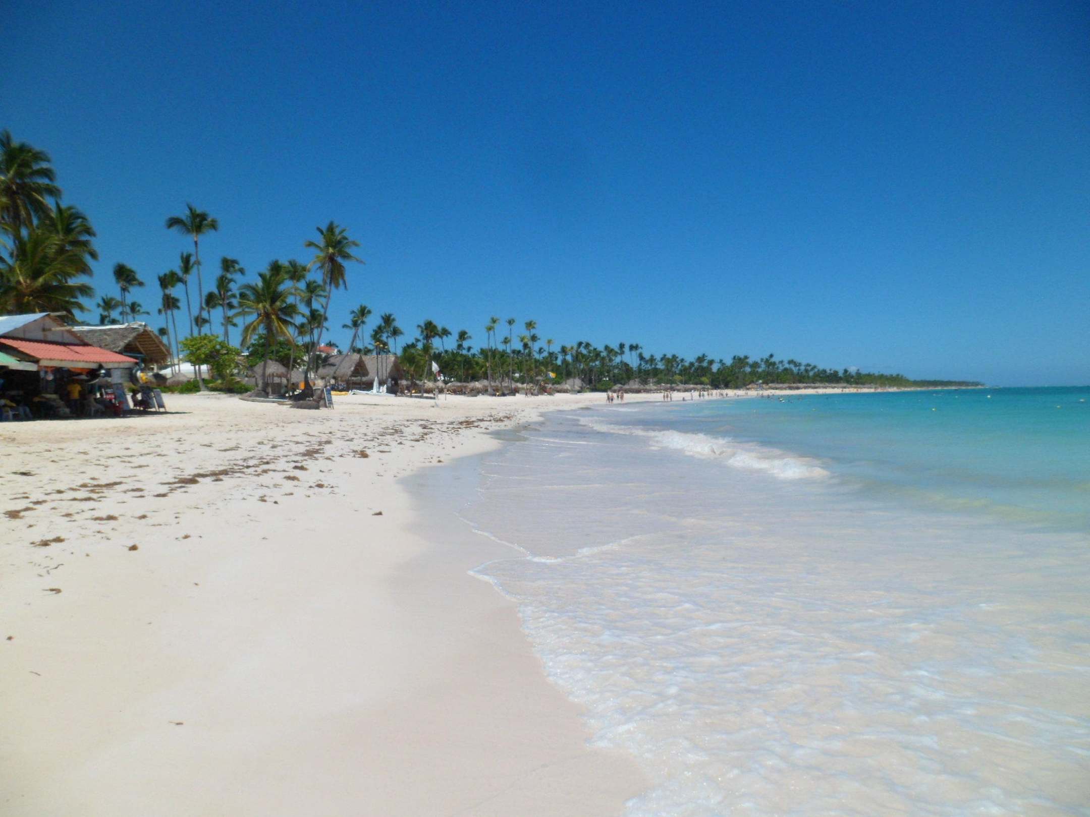 Ende der "Einkaufsmeile".Hinter der Bude mit dem roten Dach beginnt das Areal vom Iberostar, ziemlich genau da, wo der Seetang schon weg geräumt ist.
