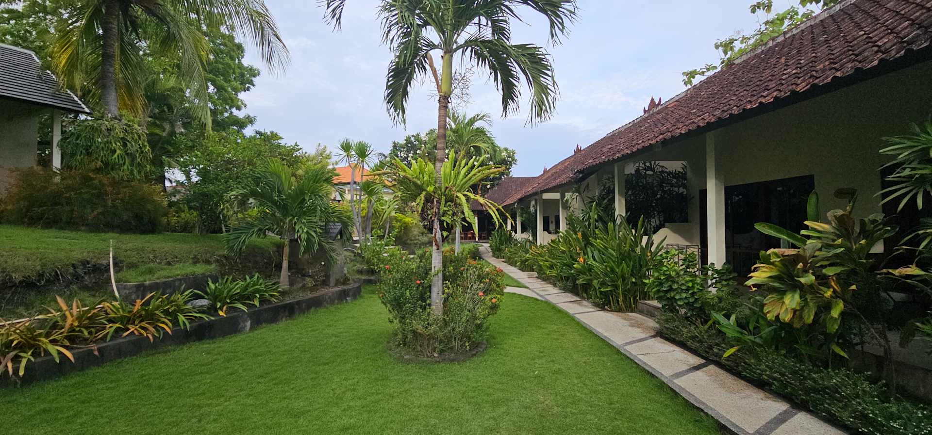 AußenansichtBlich entlang der unteren Bungalowreihe (Zimmer 1-4) in Richtung Restaurant. Links beginnt die obere Reihe.