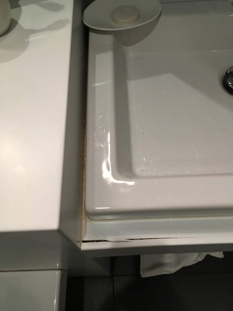 Kante des Waschbeckens angebrochen. Zwischen Möbel und Waschbecken wurde nicht sauber gereinigt!