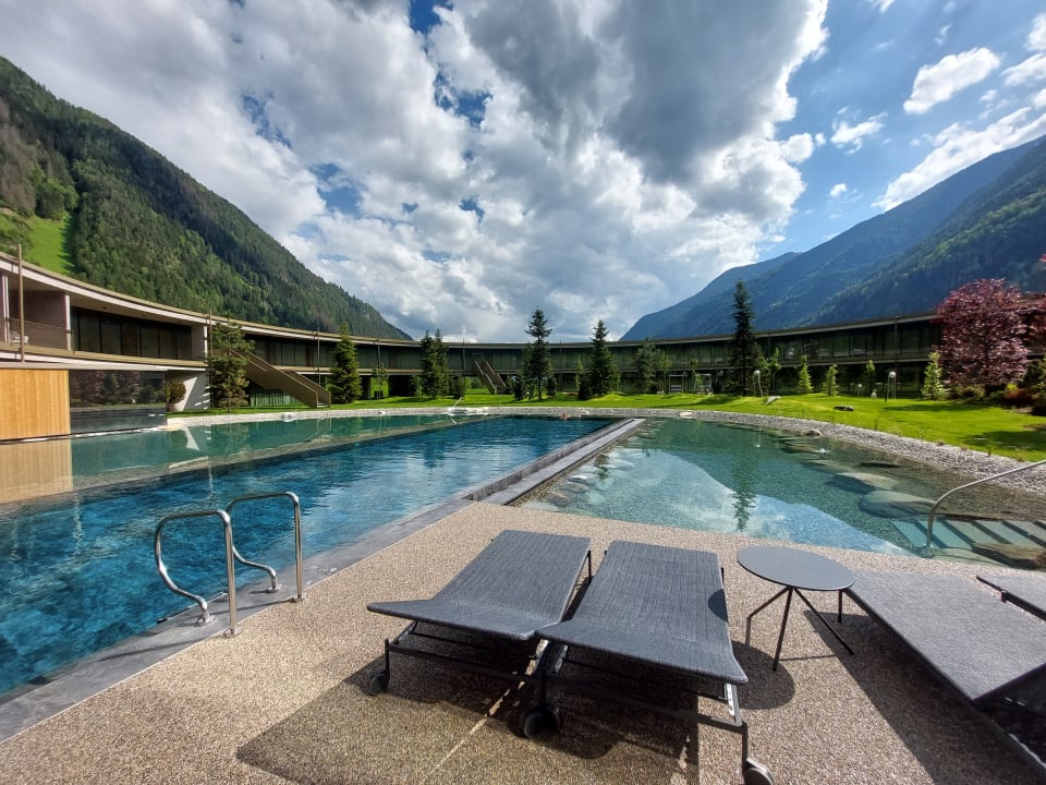 Blick auf das Pool und die Gartenanlage im Innenhof.
