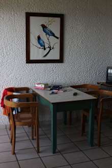Im Wohn/Esszimmerbereich steht dieser Tisch. Rechts daneben der klitzekleine Fernseher.
