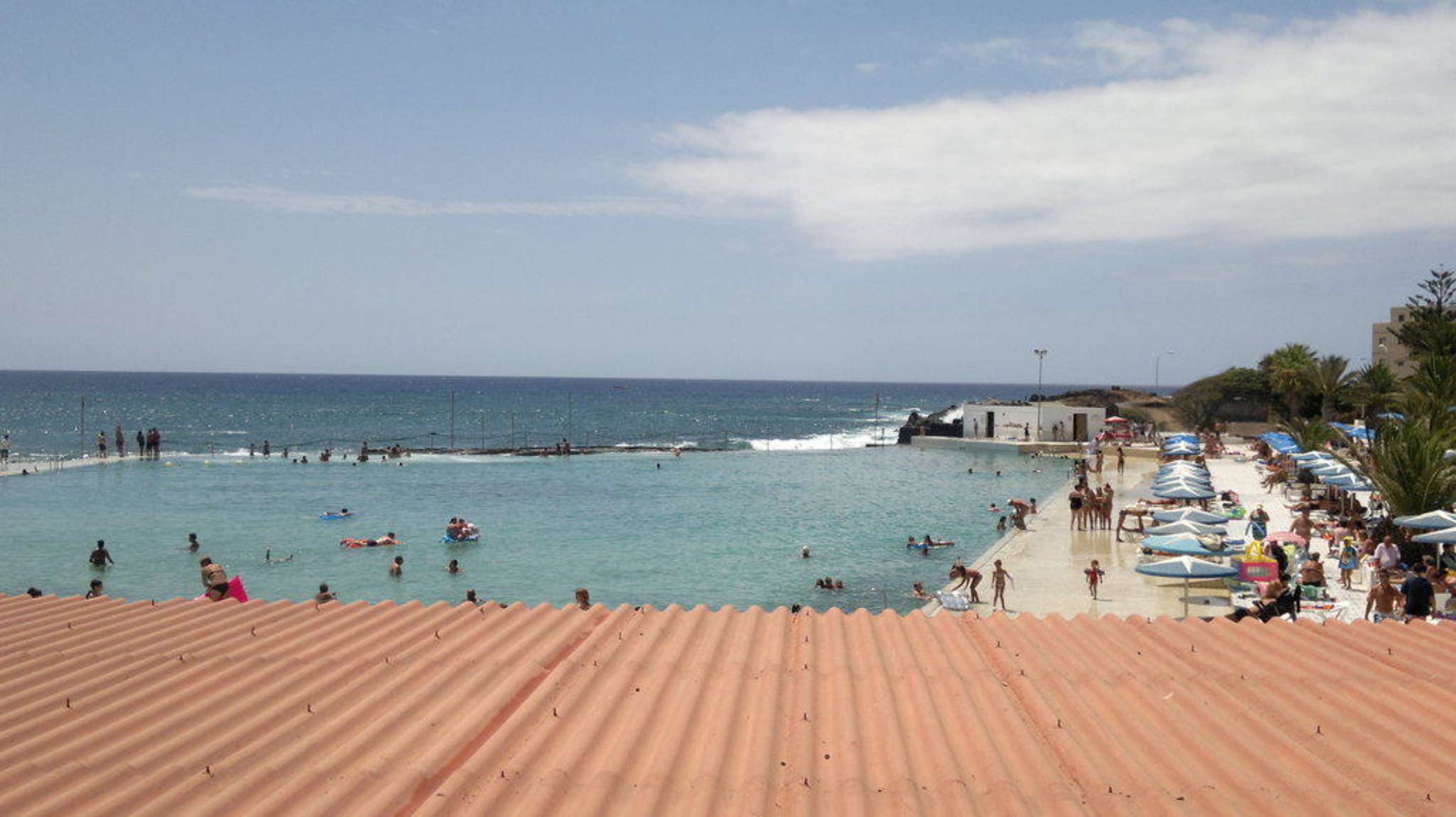 Vom Speisesaal aushat man den vollen Überblick. Das Dach am unterem Bildrand gehört zur Poolbar, die unter dem Speisesaal liegt.