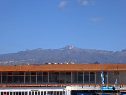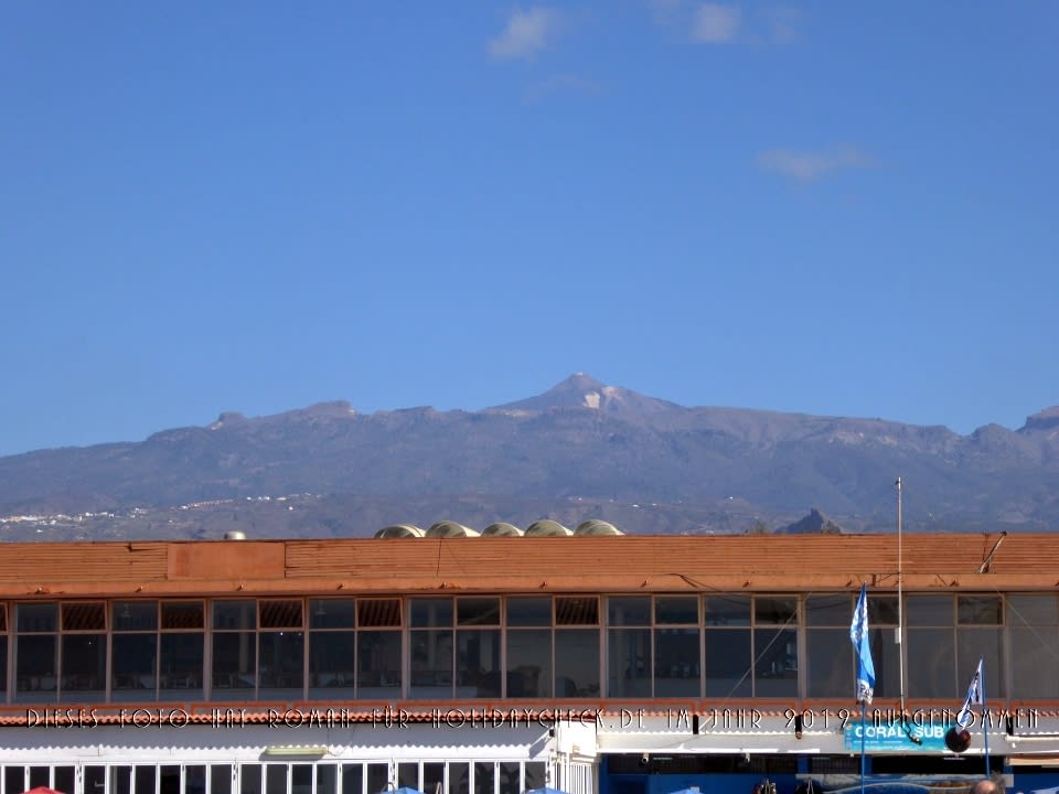 PoolBlick vom Poolbereich auf das Gebäude mit Bar (unten) und Speisesaal (oben), darüber der höchste Berg Spaniens: El Teide.